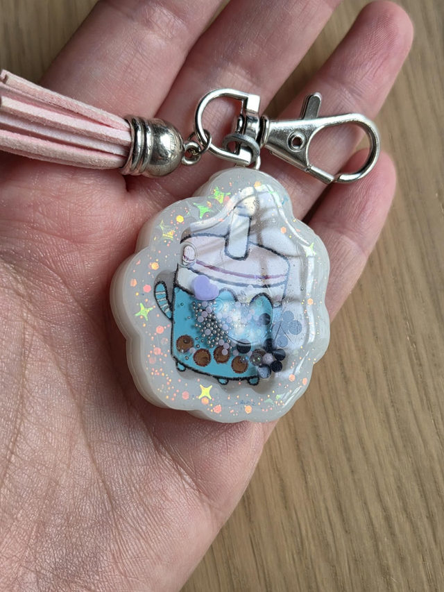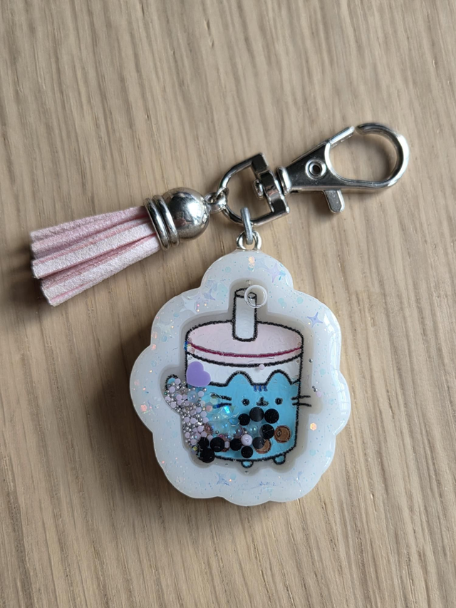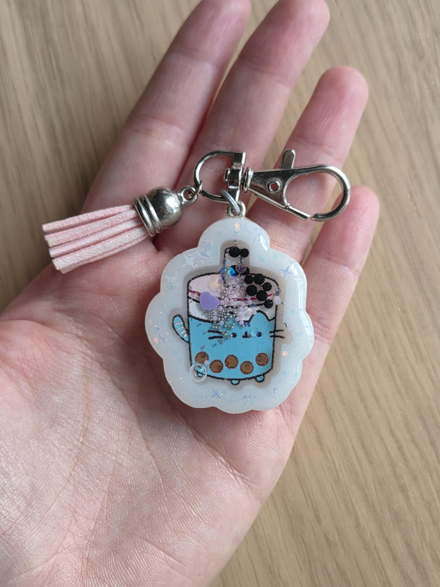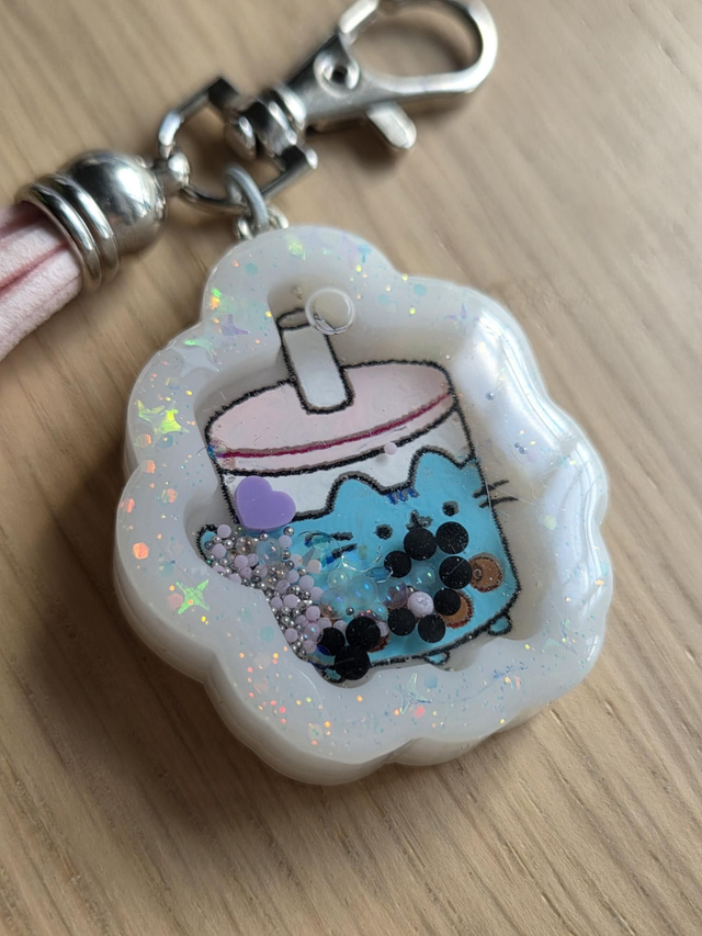 Llavero agitador hecho con resina a mano de gato con forma de batido.