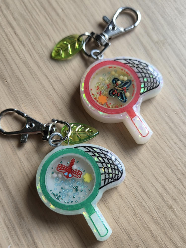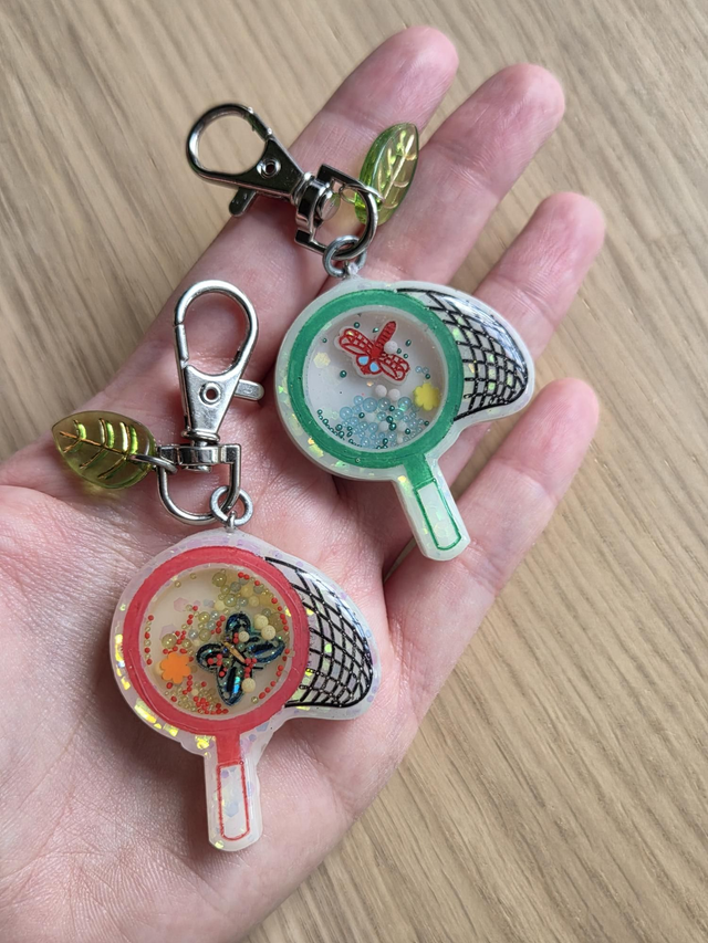 Llavero agitador hecho con resina a mano de redes con insectos del juego Animal Crossing.