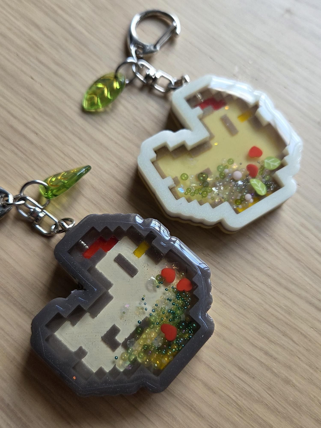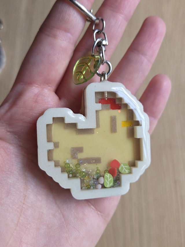 Llavero agitador hecho con resina a mano de gallina de SV o Zelda.